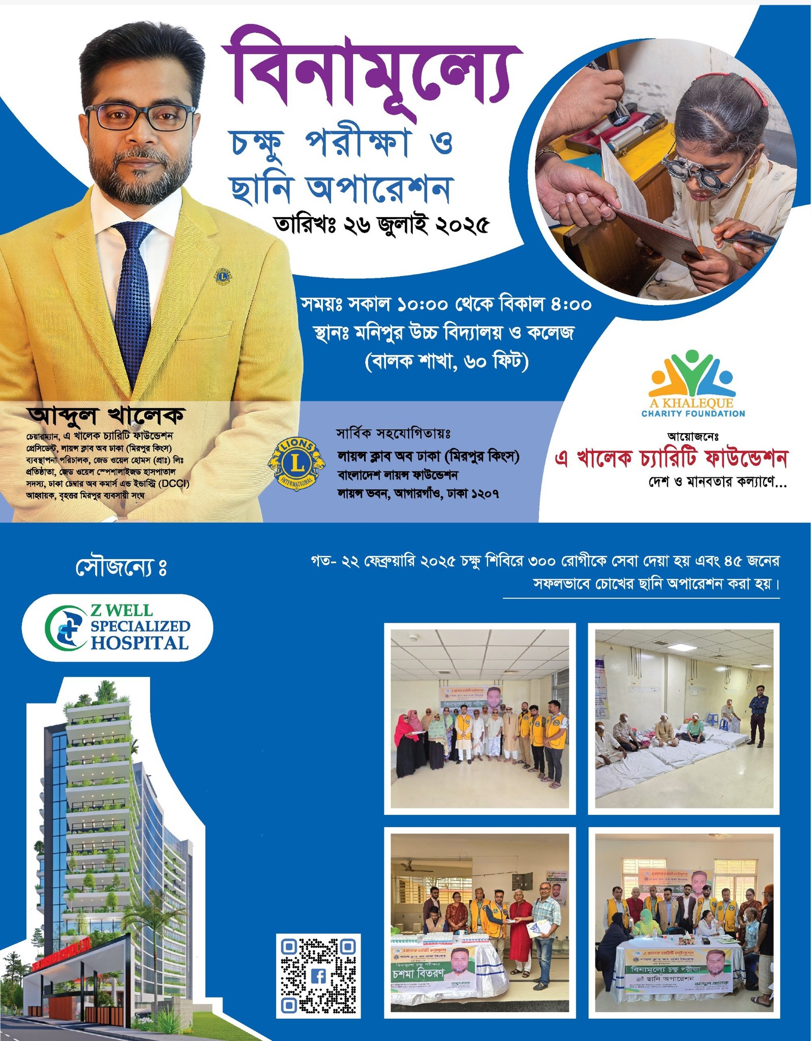 লায়ন্স ক্লাব অফ ঢাকা মিরপুর কিংস এর ২০২৫-২৬ সেশনের প্রেসিডেন্ট আব্দুল খালেক এই আসন্ন চক্ষু চিকিৎসা ক্যাম্প সফল করার জন্য এলাকাবাসীর সহযোগীতা কামনা করেন।